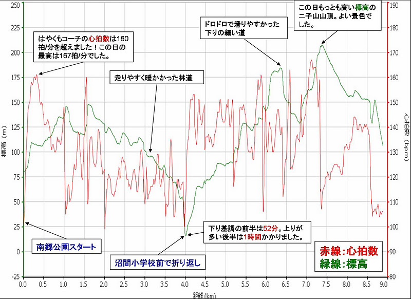 今回は167拍/分が最高でした(ニ子山山頂付近で)。