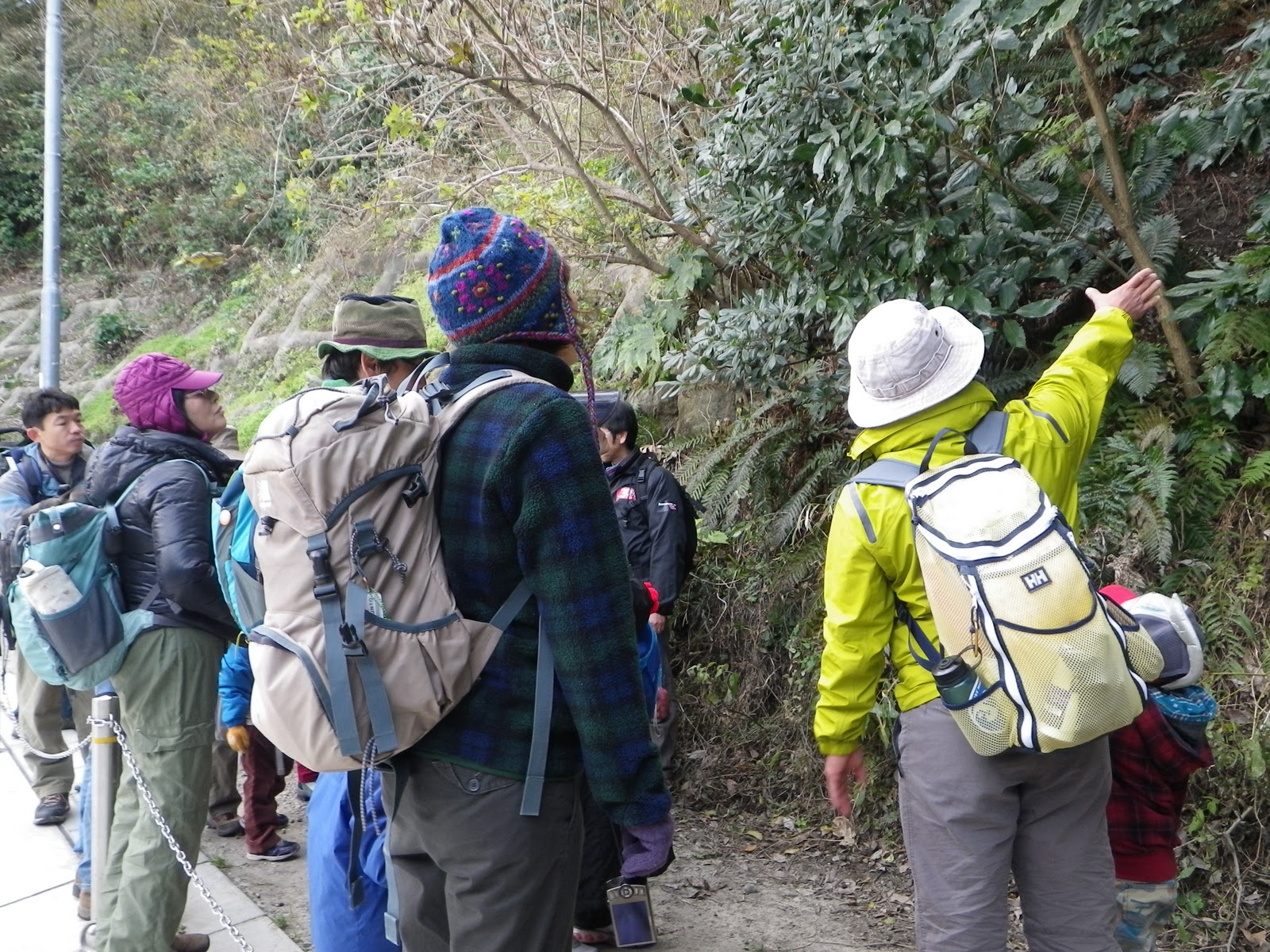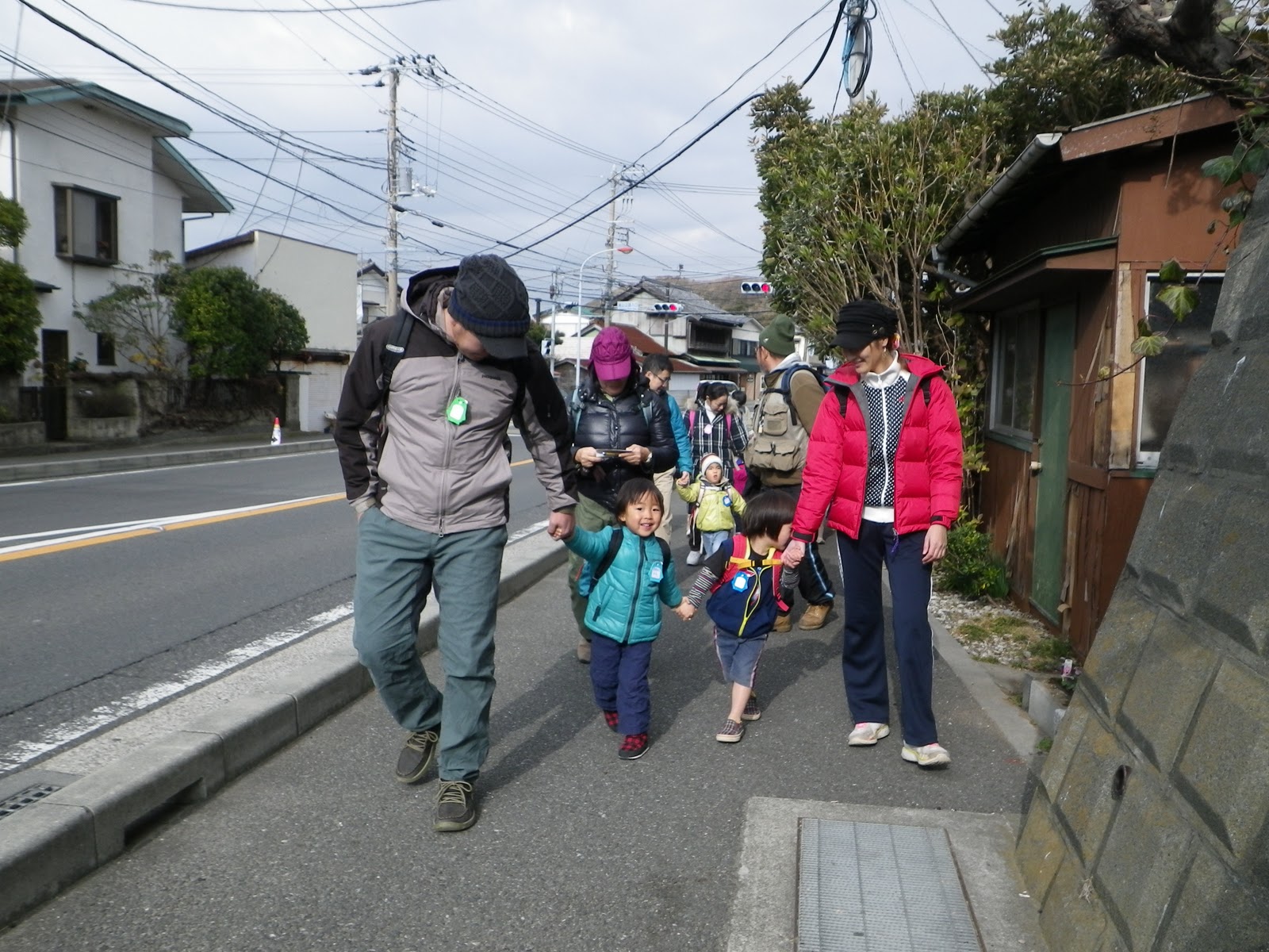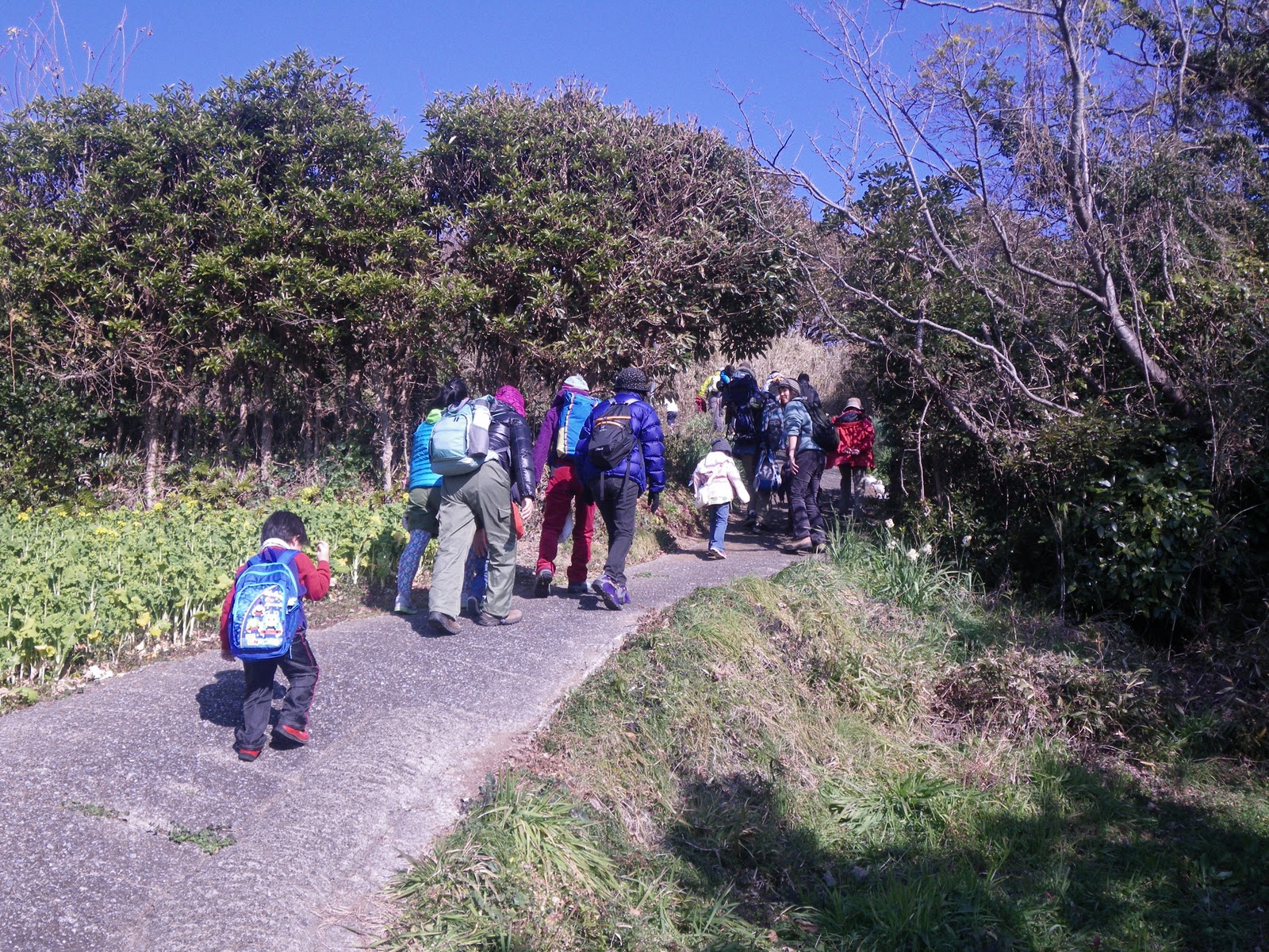 山の一本道に差し掛かると道幅が狭くなって、手をつないで歩くことができなくなってきます。