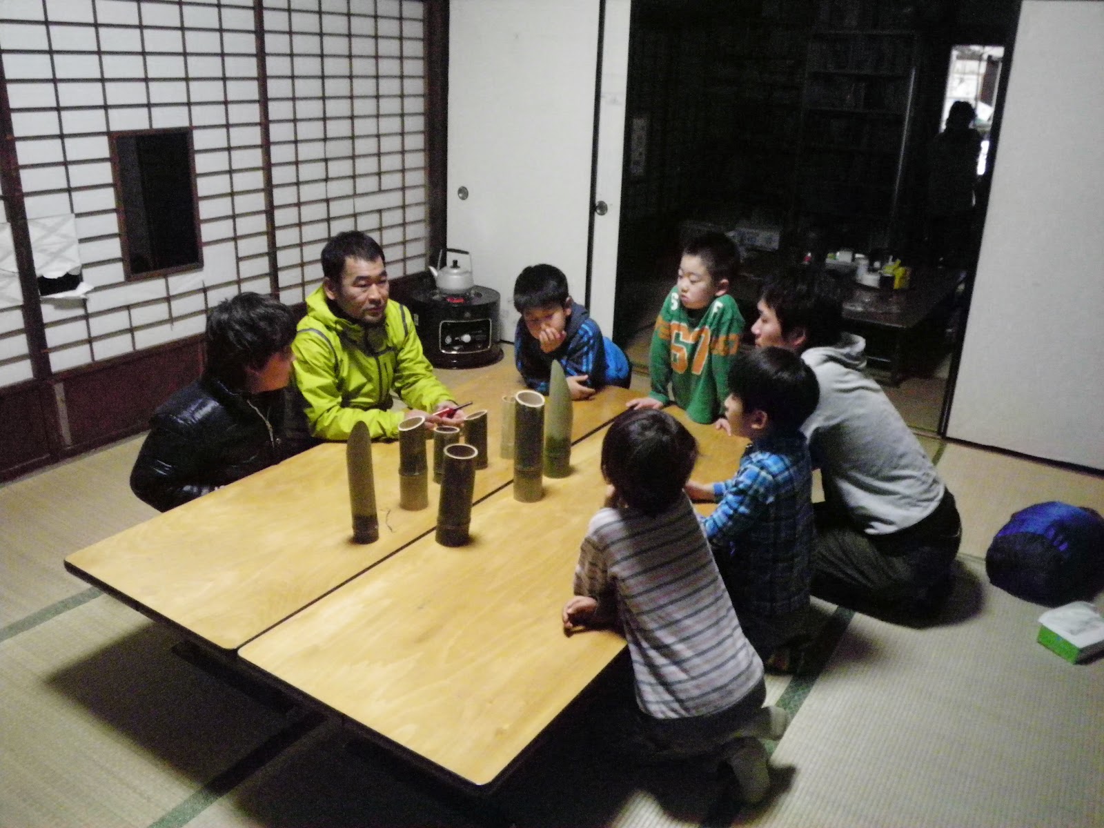 みんなが作った竹の行燈のともしびの中で静かにお話をしました。