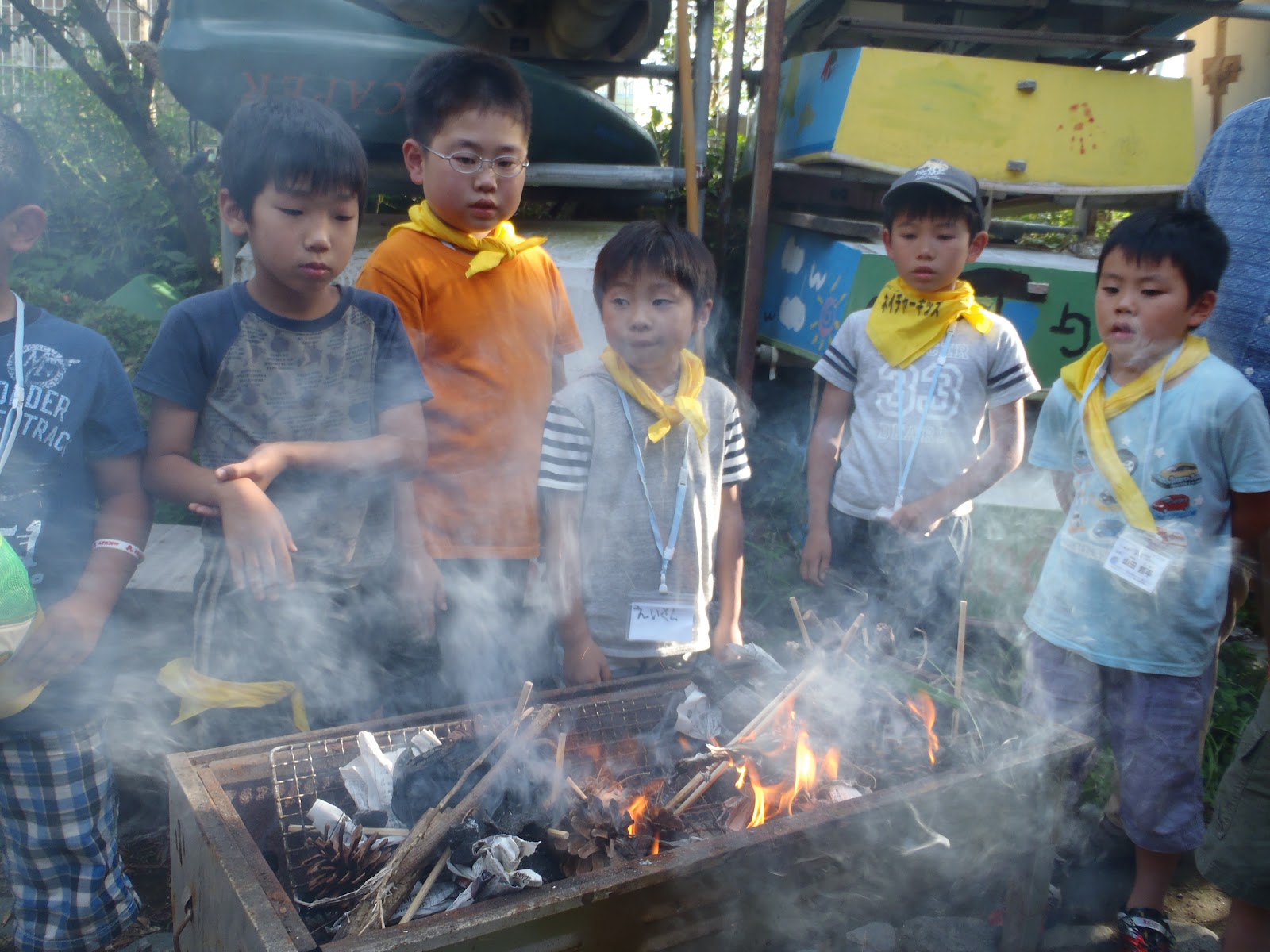 リーダーから火の起こし方を教わって、ばっちり点火!