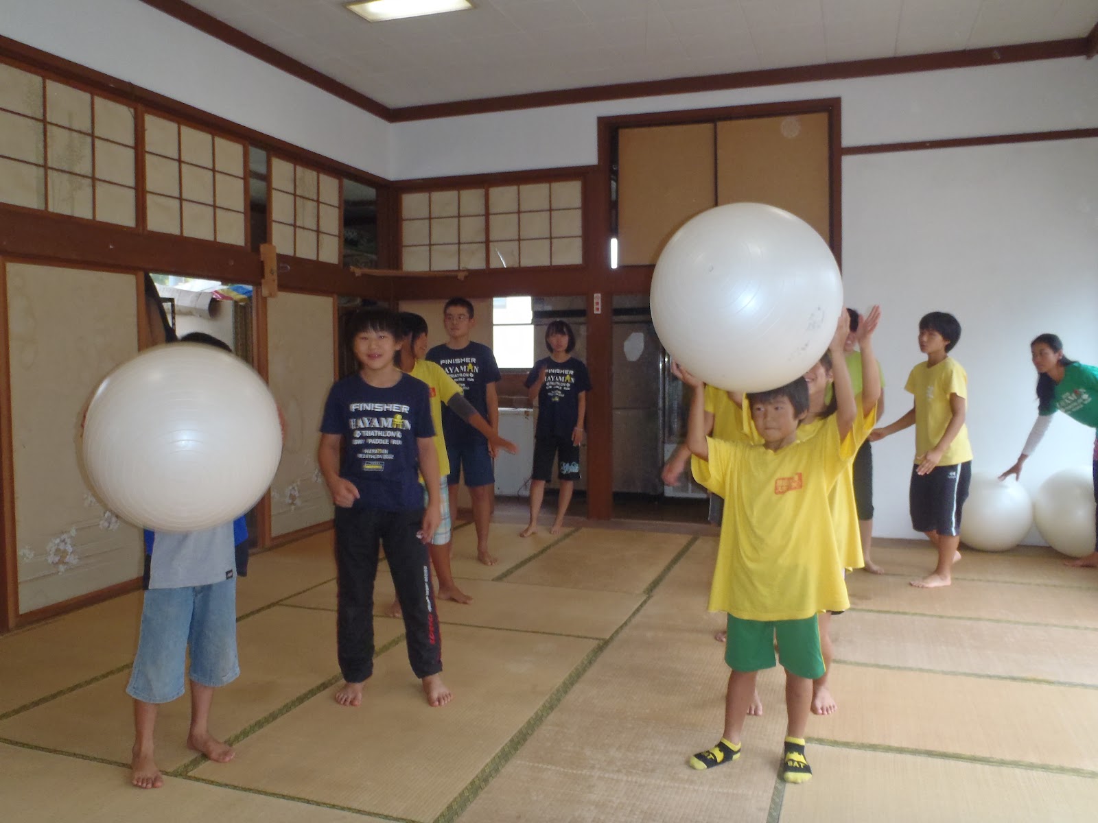 最初は、バランスを取るのが難しく戸惑っていた塾生たちも、ボールの上に座ることもでき、最後には全員で円陣を組むことにトライしました。