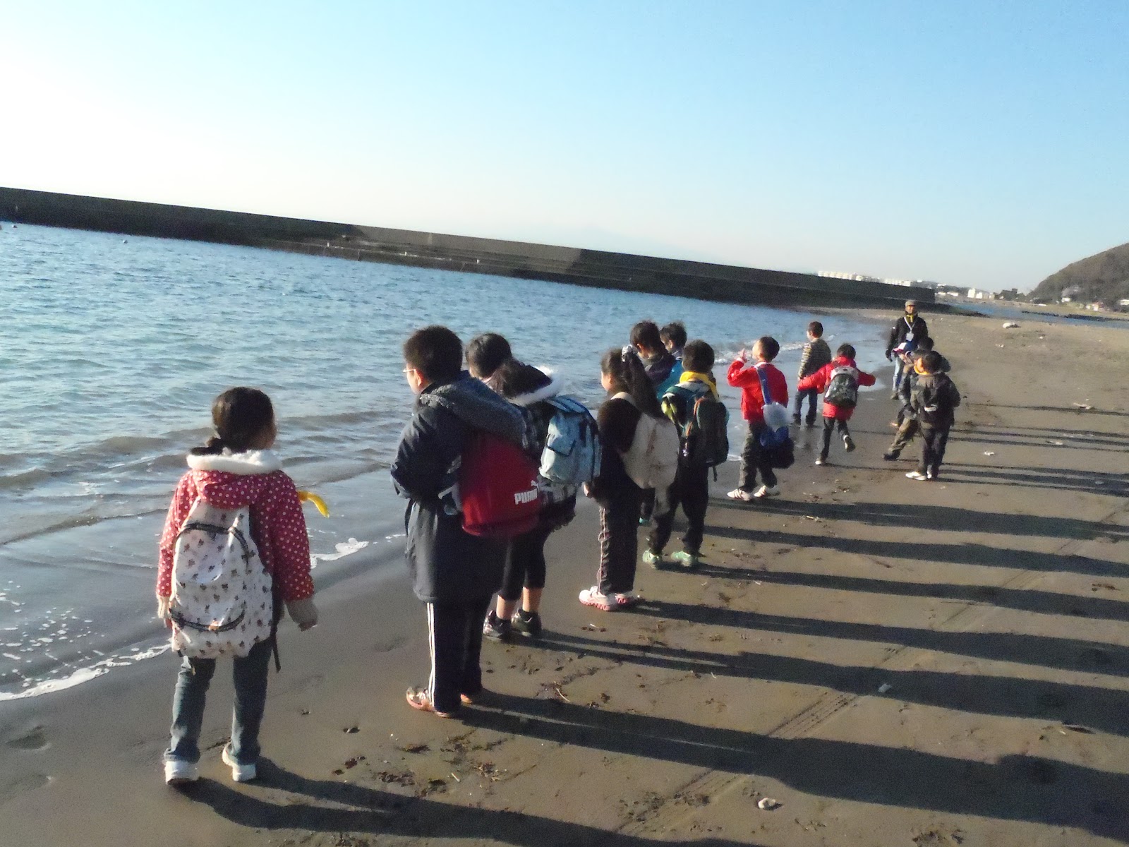 ゆうべは冷え込みが厳しくて寒かったですが、朝はしっかり目をさまして、まずは海へ朝のお散歩に出かけました。