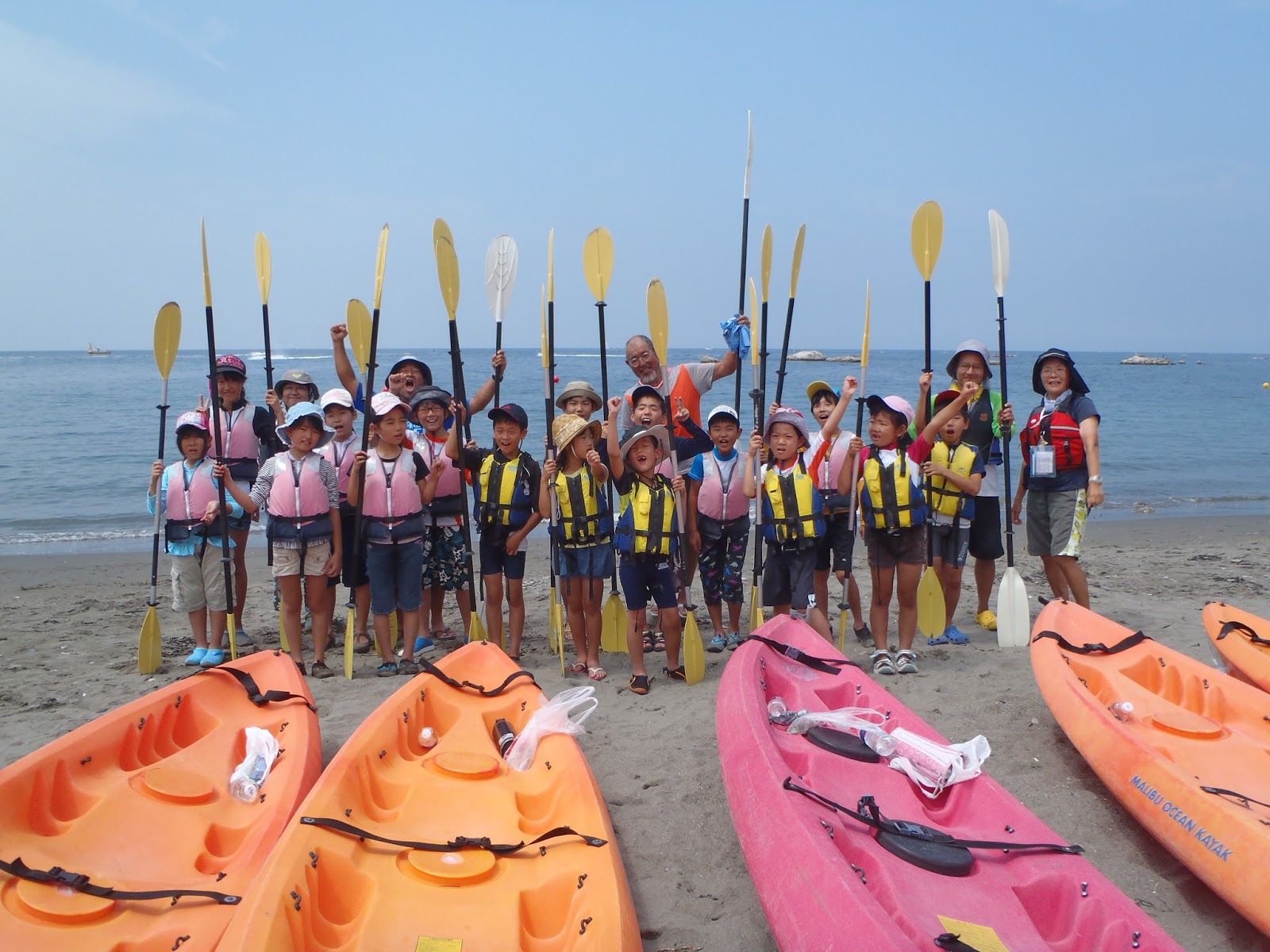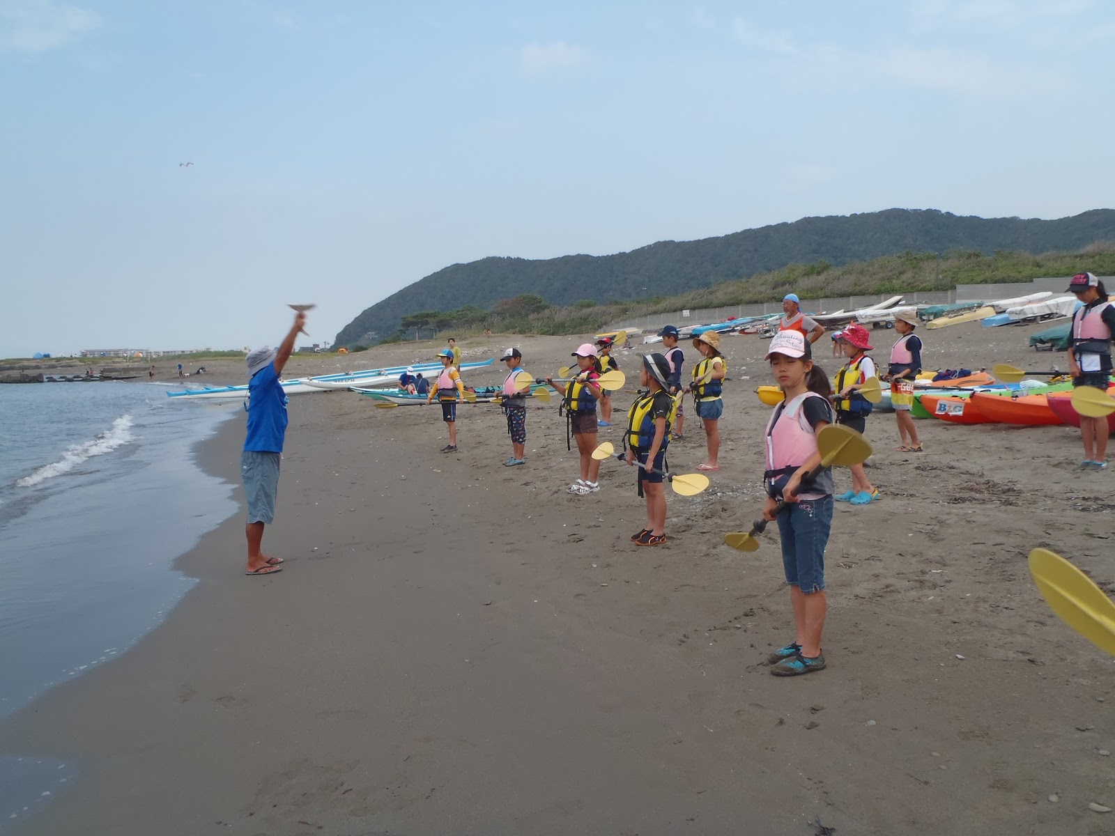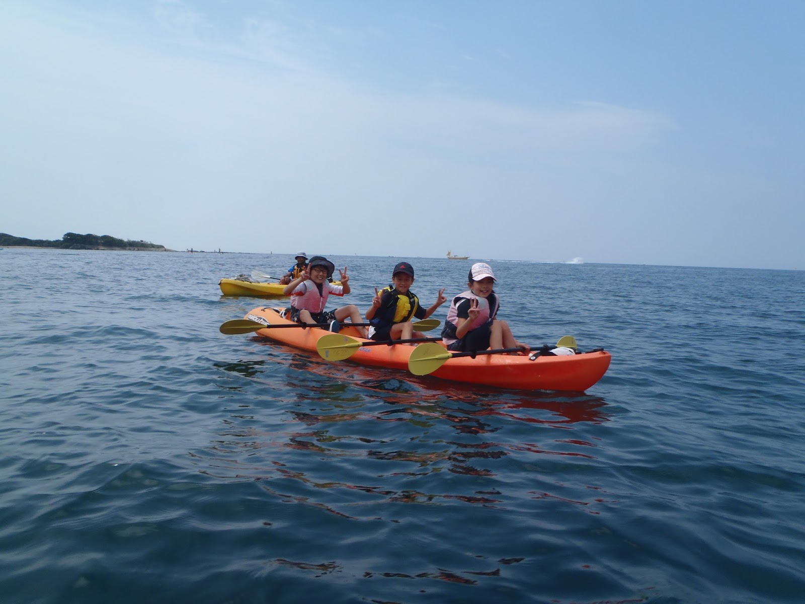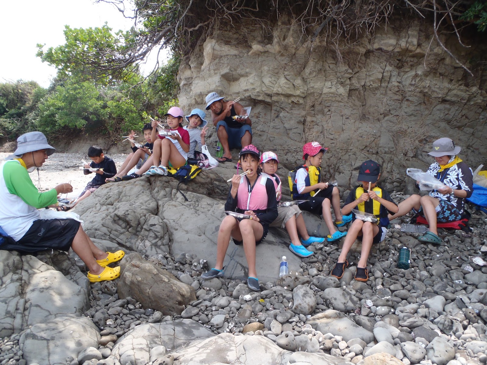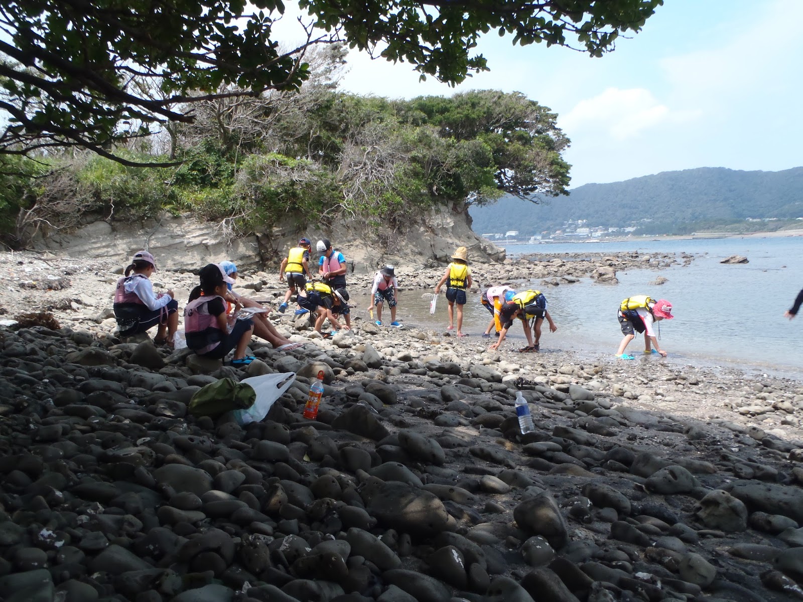 大浜海岸までは、みんなで力を合わせてシーカヤックを運び、パドリングの練習をしてから大海原へ漕ぎ出しました。2人もしくは3人で乗艇し、声を合わせて「右、左、右、左・・・」、最初はなかなか息が合わず、行きたいと思うところへ思うように進まないこともありましたが、次第に呼吸が合ってきてあっという間に対岸に上陸できました。透明度の良い海の中をマスクをつけて覗いてみると、クロダイ、キュウセン、クサフグ、キタマクラなど、昨日とは違った魚を観察することができました。