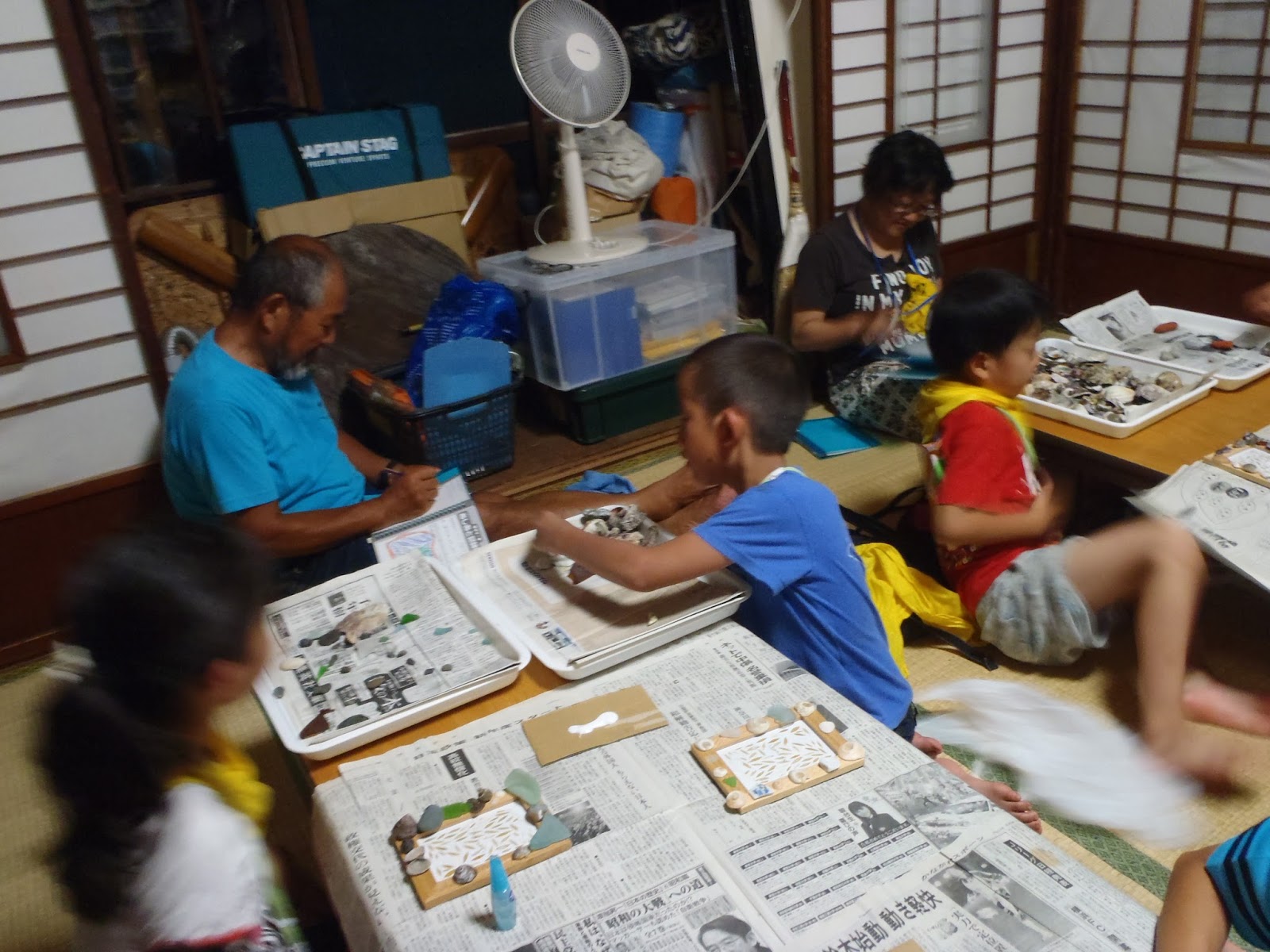 施設に戻ってふり返り。あしあと手帳を書いてから、今日、長者ケ崎で拾った貝で、オリジナルフォトフレームを作りました。それぞれ個性豊かな作品が出来上がりました。今回の思い出の写真を入れて、お部屋に飾っていただけるとよいと思いますし、夏休みの自由研究にもなるのではないでしょうか。