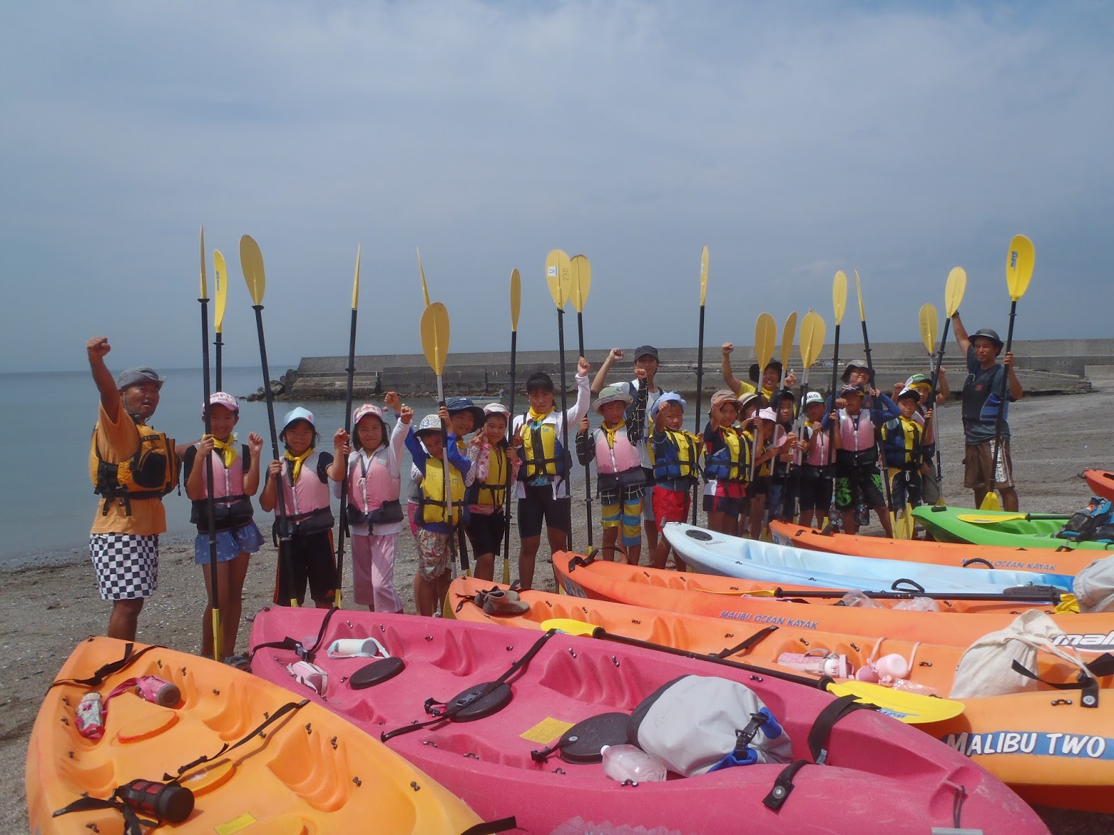 今日の活動はシーカヤック。長者ケ崎海岸でパドルの練習をして、いざ対岸の長者ケ崎の半島へ。初めて漕いだ人が多い中、みんな息を合わせて上手に漕げました。