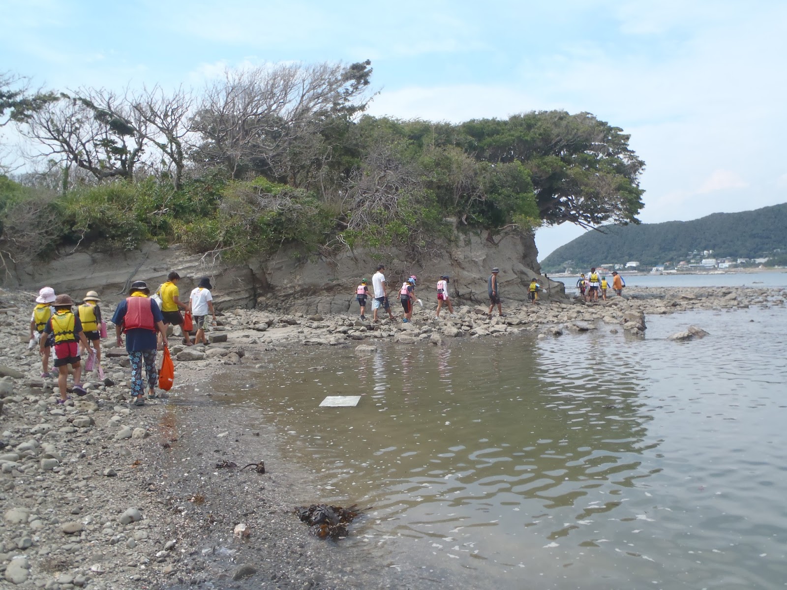 上陸した長者ケ崎は、潮が引き始めていて、ヒライソガニ、オウギガニ、ムラサキウニ、ホンヤドカリ、アゴハゼ、イソスジエビなど、たくさんの生きものが観察できました。