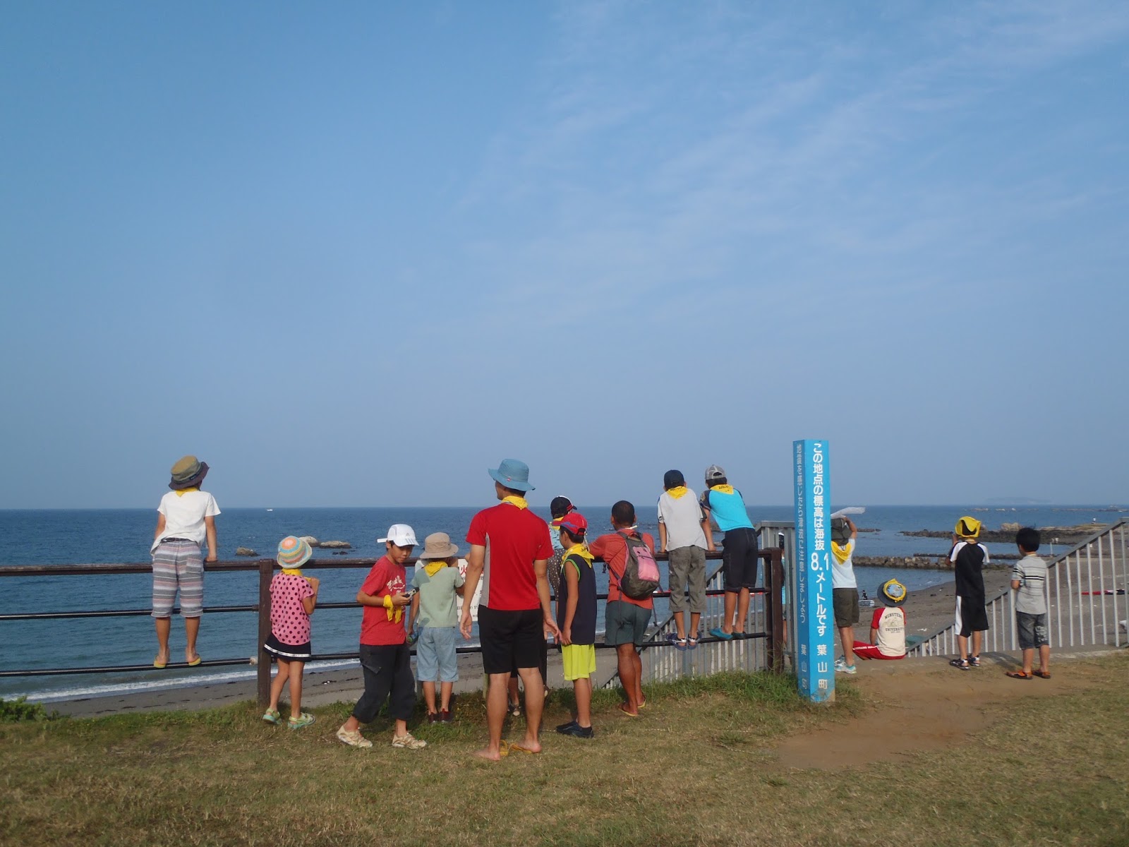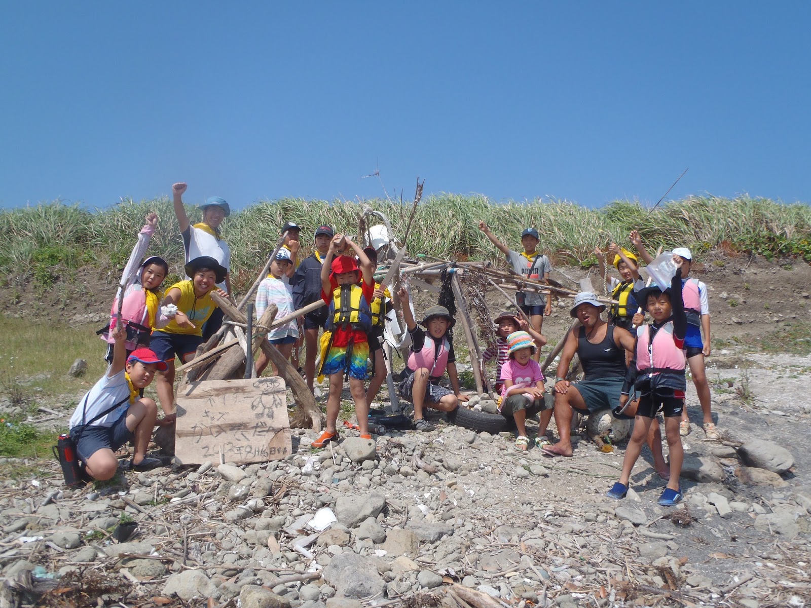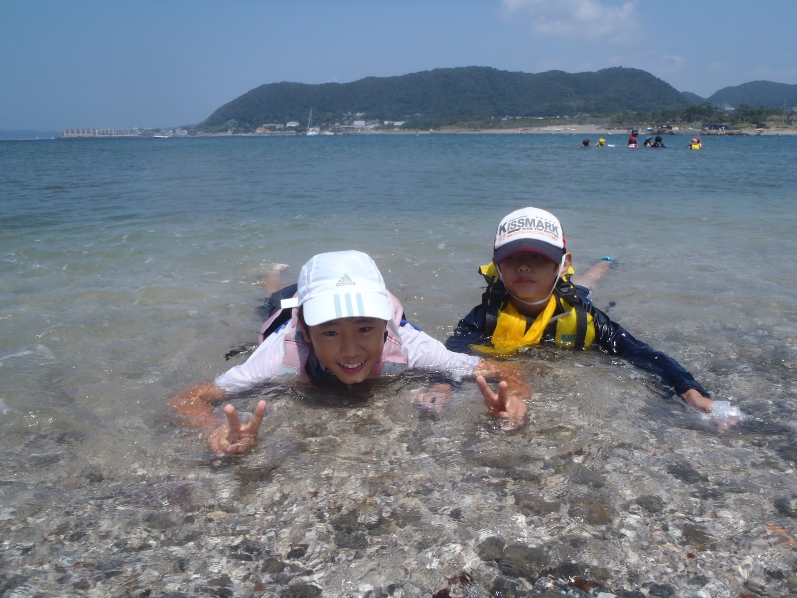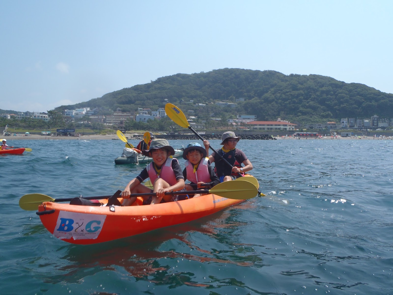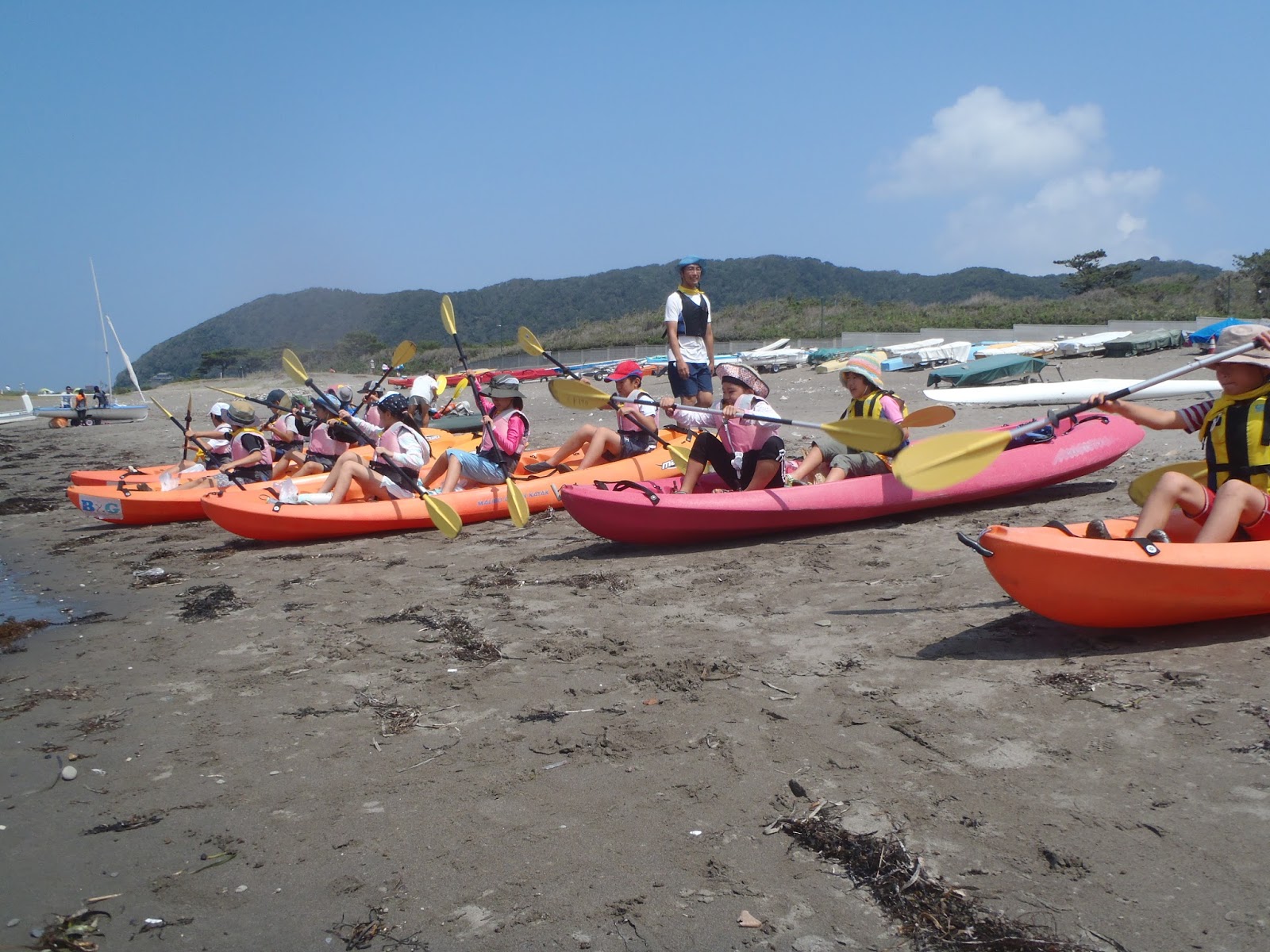 大浜海岸へシーカヤックを下して、まずはパドリングの練習。その後、乗艇の仕方を学んで、いざ、海へ!今日は、昨日より少しうねりがありましたが、みんな「右、左・・・」、声と気持ちを合わせて漕ぎ出しました。あっという間に上達する姿に感動です。
