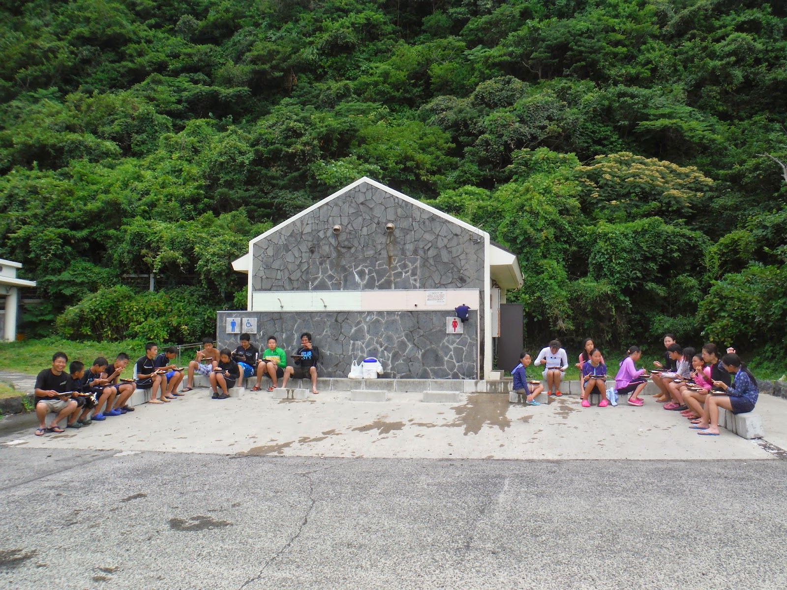 昼食を食べているとき、急に雨が降り始めました。トイレ前で昼食をとっているキッズたち、お弁当をひっくり返して、みんなからお裾分けをもらっているキッズなど、突然、面白いことが起こりますね。