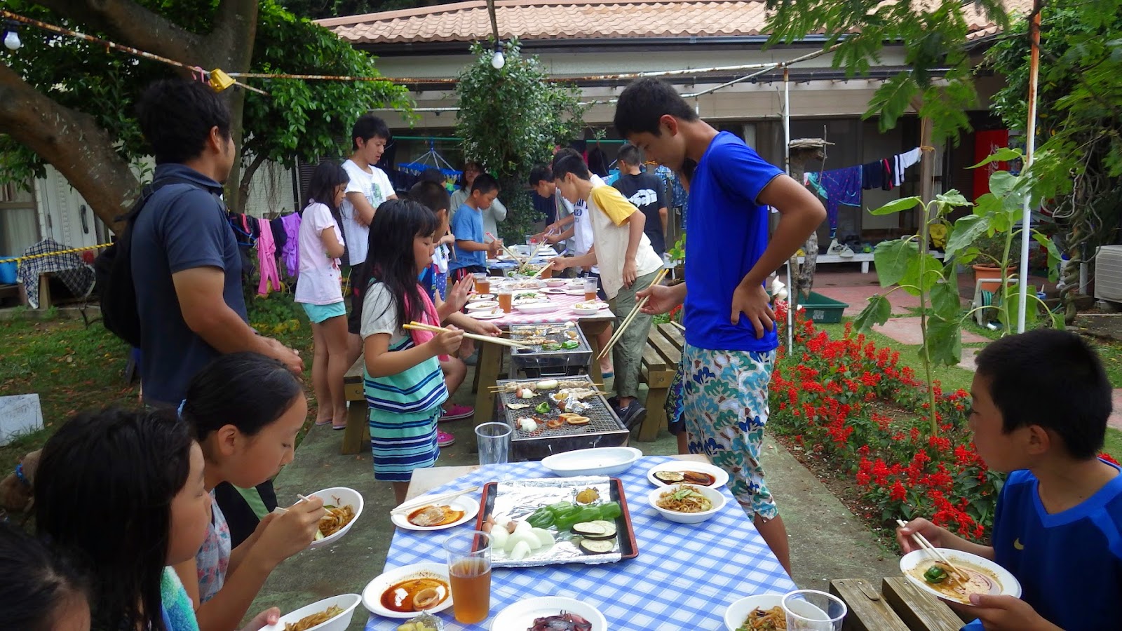 今日は、楽しみにしていたBBQ。大きな魚(フエダイ、メジナ)、タカベ、クサヤはみんなで食べます。班毎では、三枚肉、焼き鳥、野菜焼きなどを自分たちで焼きました。そのほか、焼きおにぎりや焼きそばを主食にして、最後は大きな三宅島スイカを食べました。