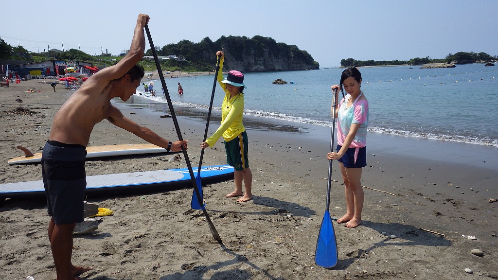 初めてのSUP!基本的な漕ぎ方を陸で確認します。