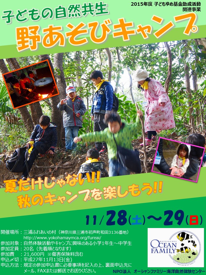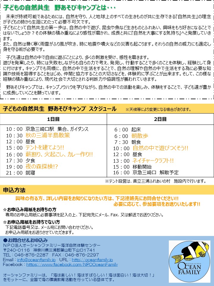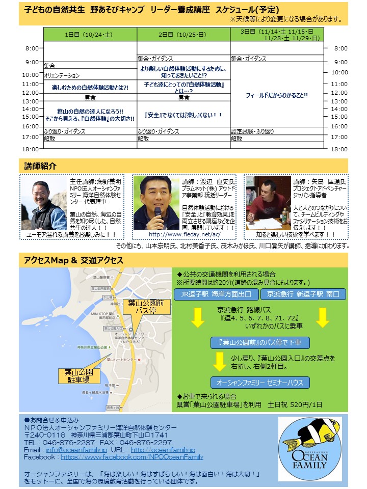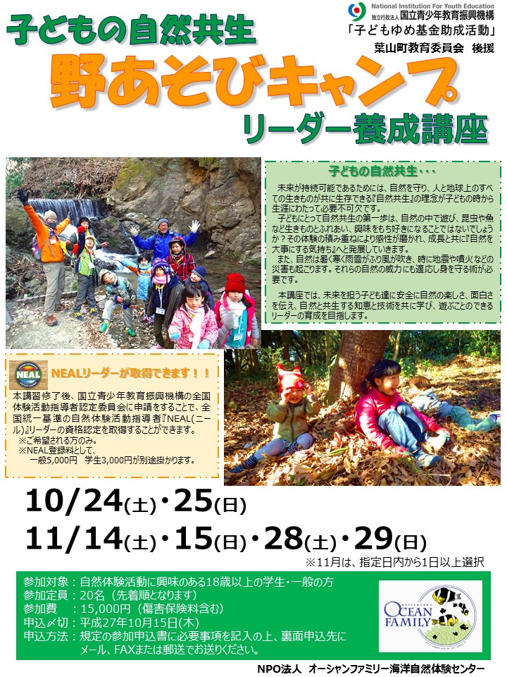 10月24日から開催する、『子どもの自然共生 野あそびキャンプリーダー養成講座』