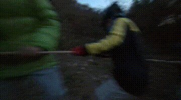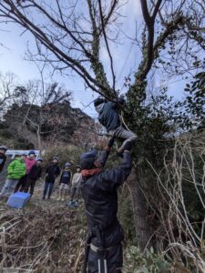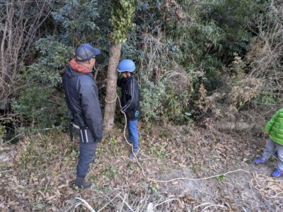 今日切るクヌギの木に、引っ張るためのロープをかけます。