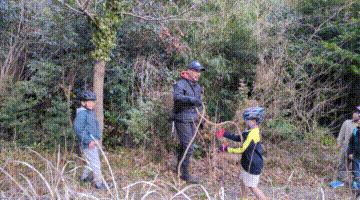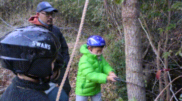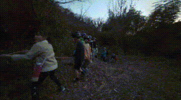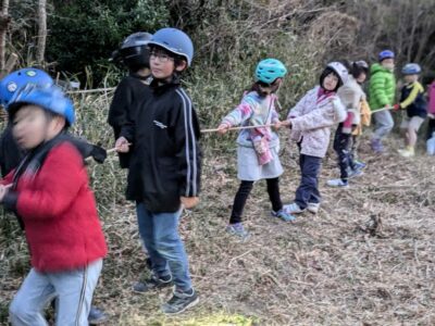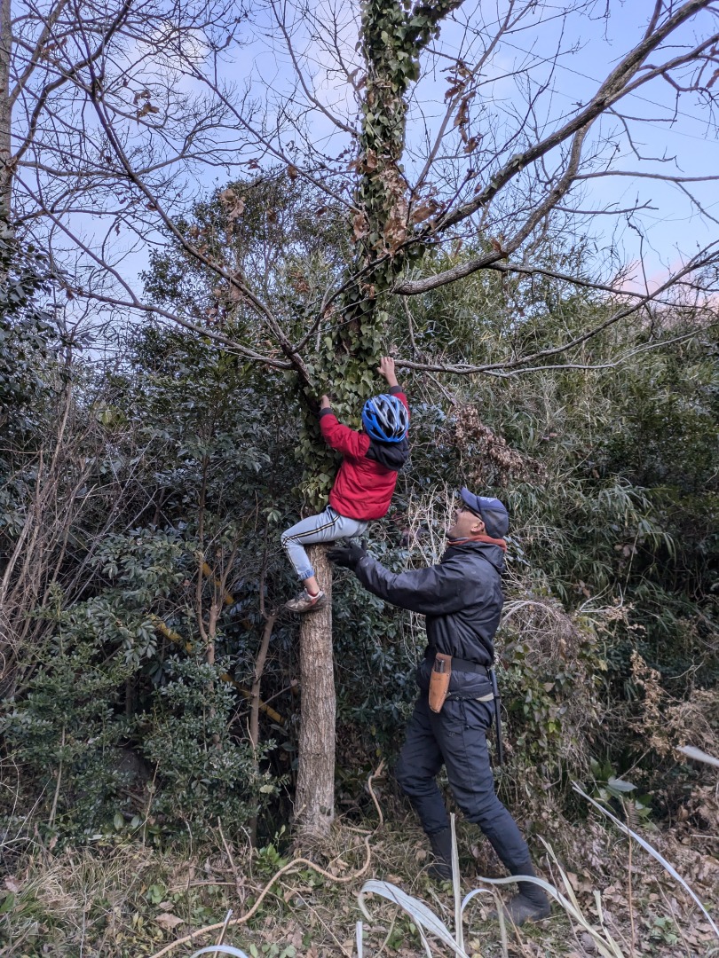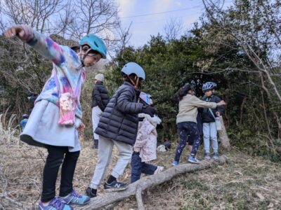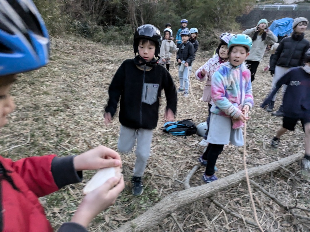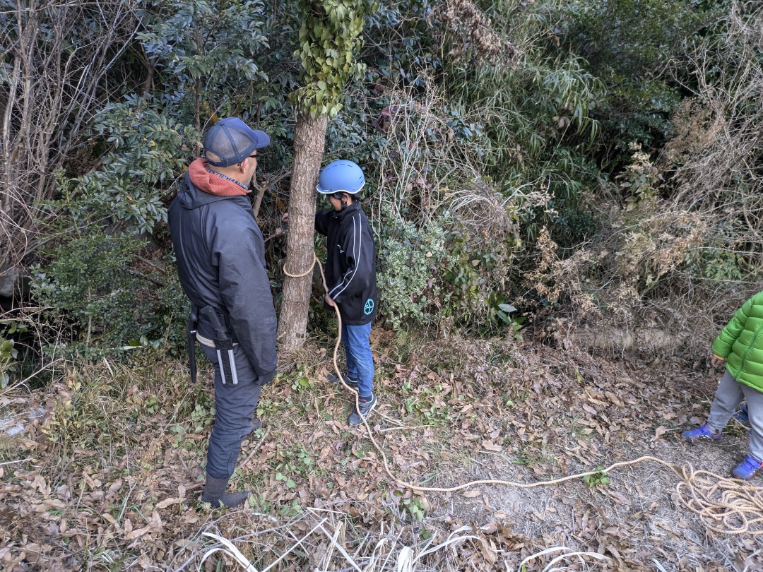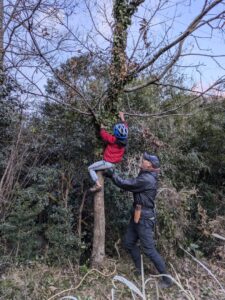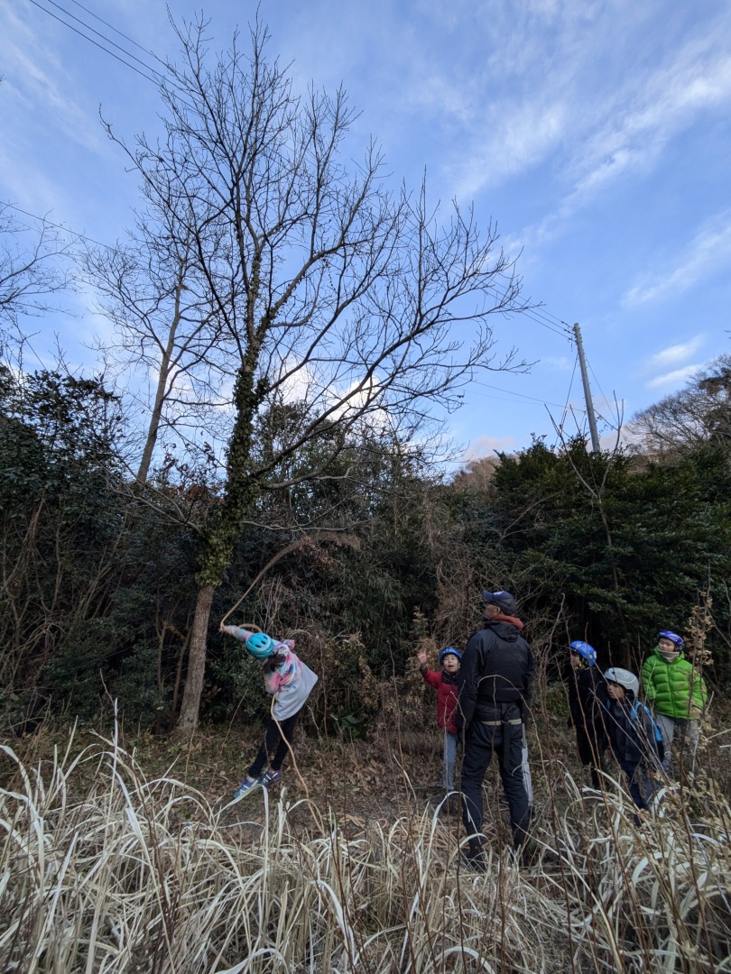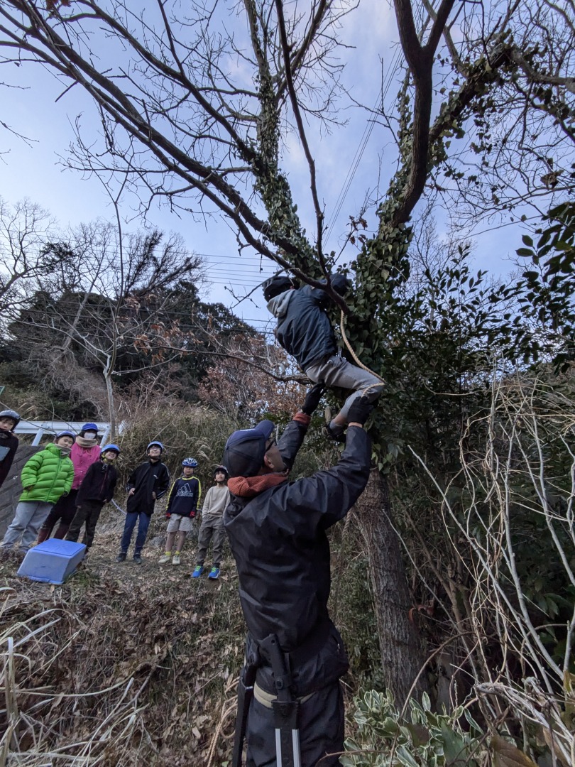 今日の「葉山キッズschool:木曜クラス」は、シイタケ用の木をノコギリとロープで切り倒しました。