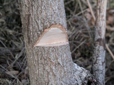 倒したい方向に受け口をつくるため、順番にノコギリで切ります。