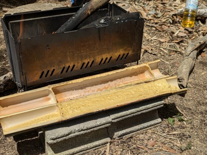 その後、材料を注ぎ込んだ、竹フライパンをのせて。。