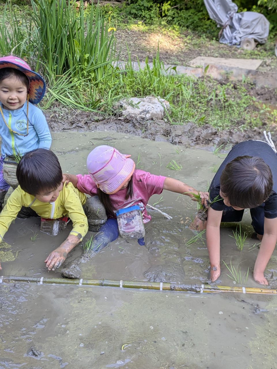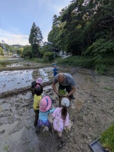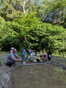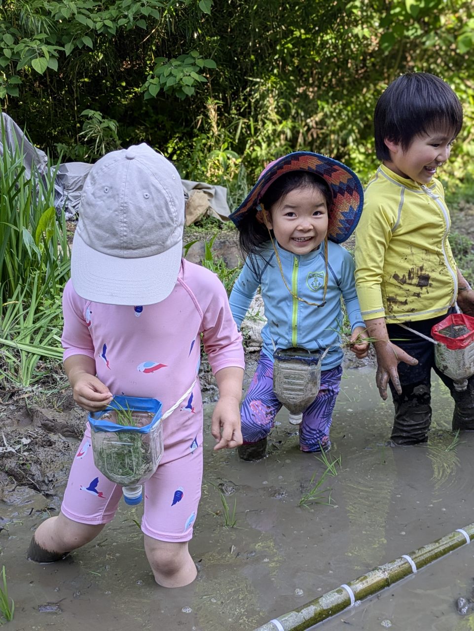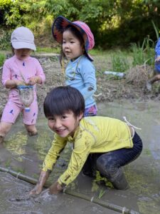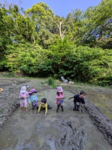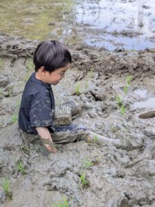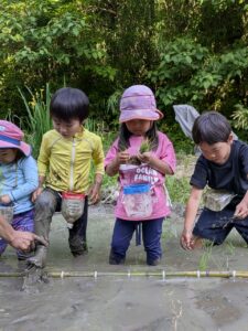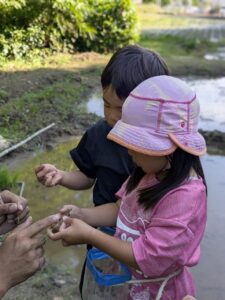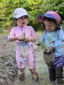 【Pre】田植えをしたぞ~!2025-05-28今日の「Pre」は、田植えをしました! ハイエースで出発。 木古庭の田んぼに到着。 苗の入れ物を腰に結びます。 稲の苗を一本ずつくばり、お米から根っこと茎がでてるのを観察。 もみ殻に包まれている茶色の米つぶと普段食べている白いご飯がすぐにはつながらない様子でしたが、もみ殻をつぶすと白い米がでてきて、みんな納得していました。 おそるおそる田んぼに入って、田植えスタート! 最後は生きものさがし。 温水シャワーをおかりして泥を落とし、着替えて帰ります。 また来週!
