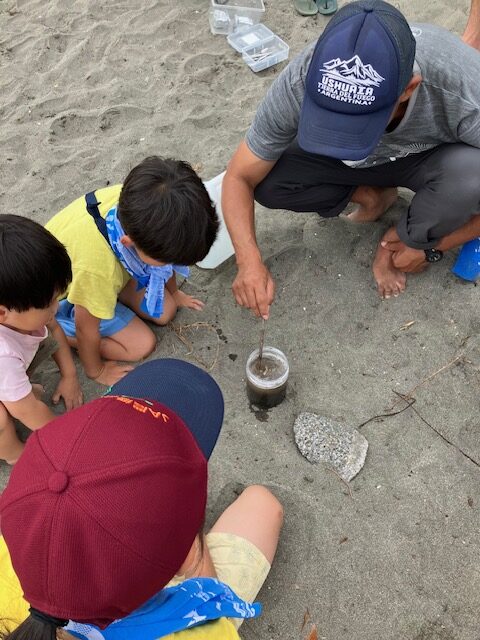 どうしてこんなに打ち上るのか葉山の海の地形や海流等の特徴をお話しして、レジンペレットが海を漂う簡単な実験をしました。レジンペレットをはじめて知った、ビーチクリーンの印象が変わった、自分たちが遊ぶ海のことを知れて良かった、海ゴミを探す視点を意識したい等々、たくさんの感想をいただきました。今日みんなで拾ったレジンペレットは高田先生に分析を依頼したいと思います。
