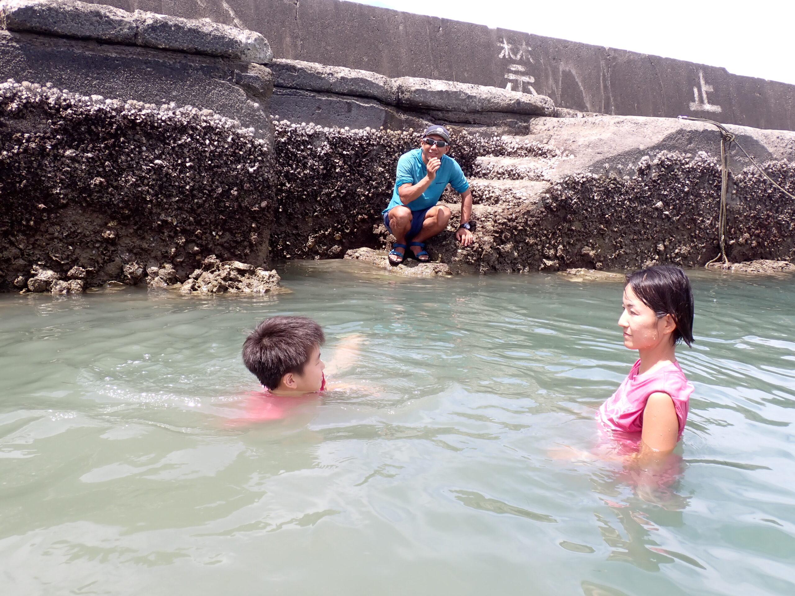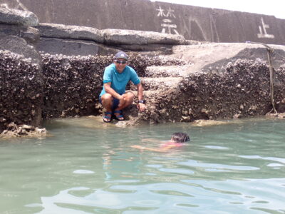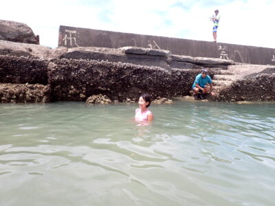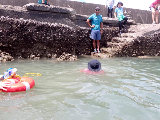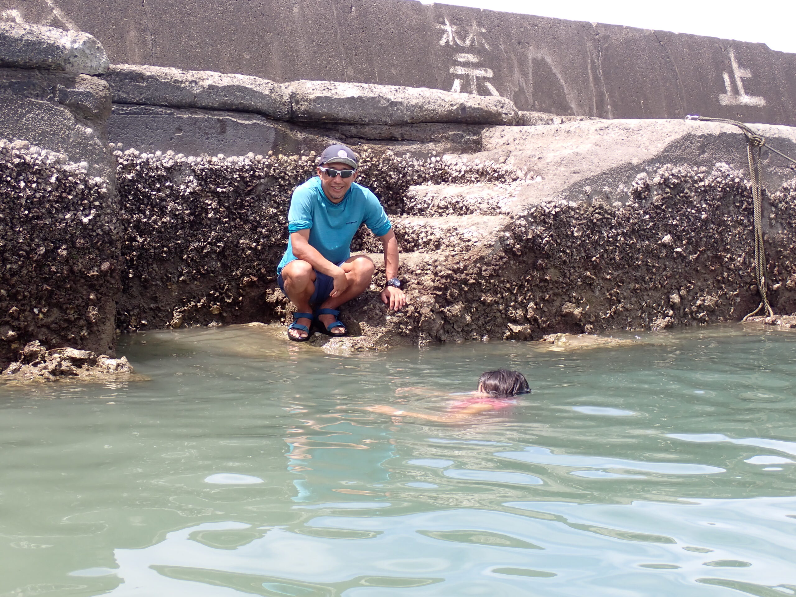 チャレンジしたい子は、防波堤まで泳いでみます。