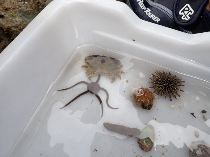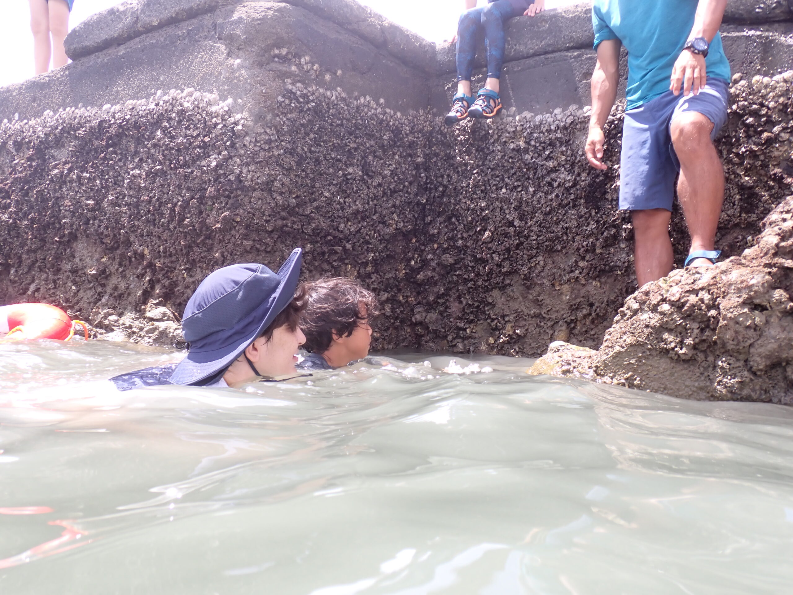 今日は予定していたカヤックはできませんでしたが、とても潮が引いていて、午前は面白い生きものをたくさん見つけたり、海中観察することが出来、午後は台風ウェーブのパワーを体で感じることが出来ました。
