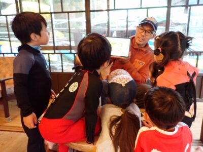 ドングリについて、写真を見せながらお話し。 稲作が伝わる前の縄文時代(約1万年前~3,000年前)には、主食とされていたこと。