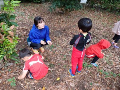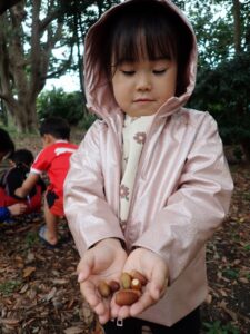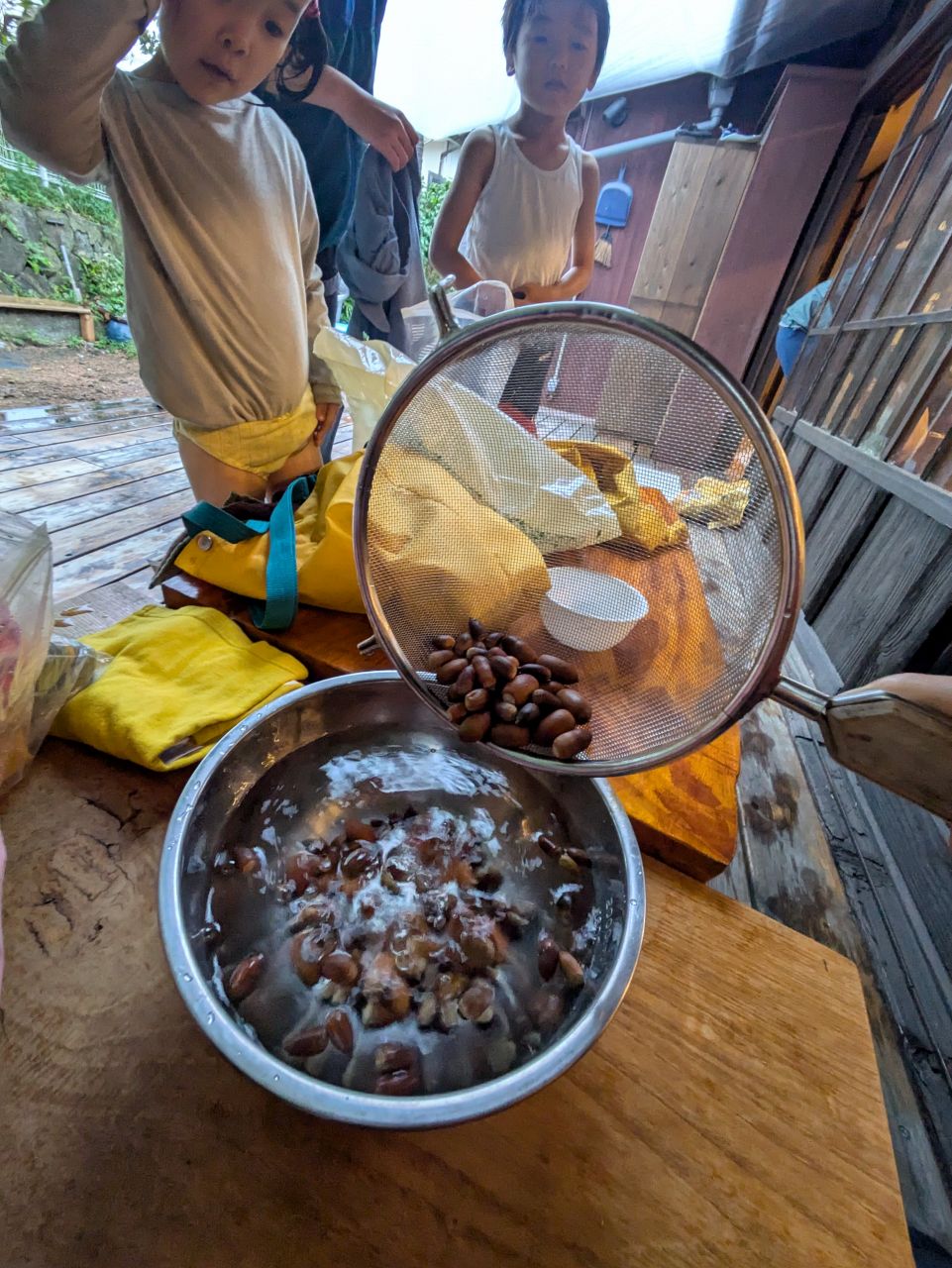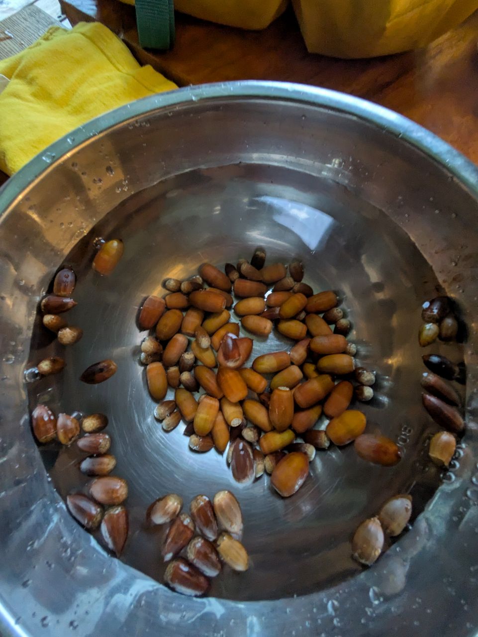 ドングリを水にいれます。ホーリーが事前に拾っておいたスダジイも一緒に。