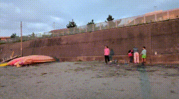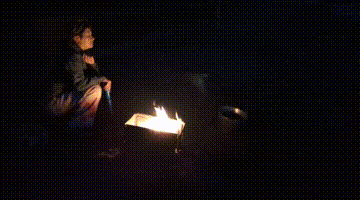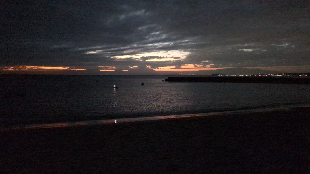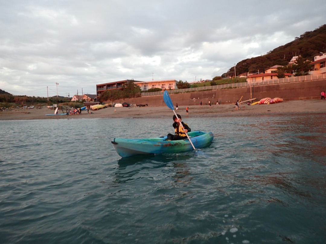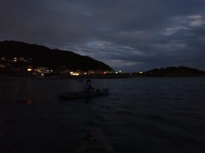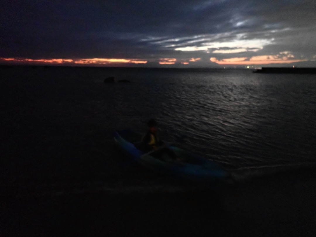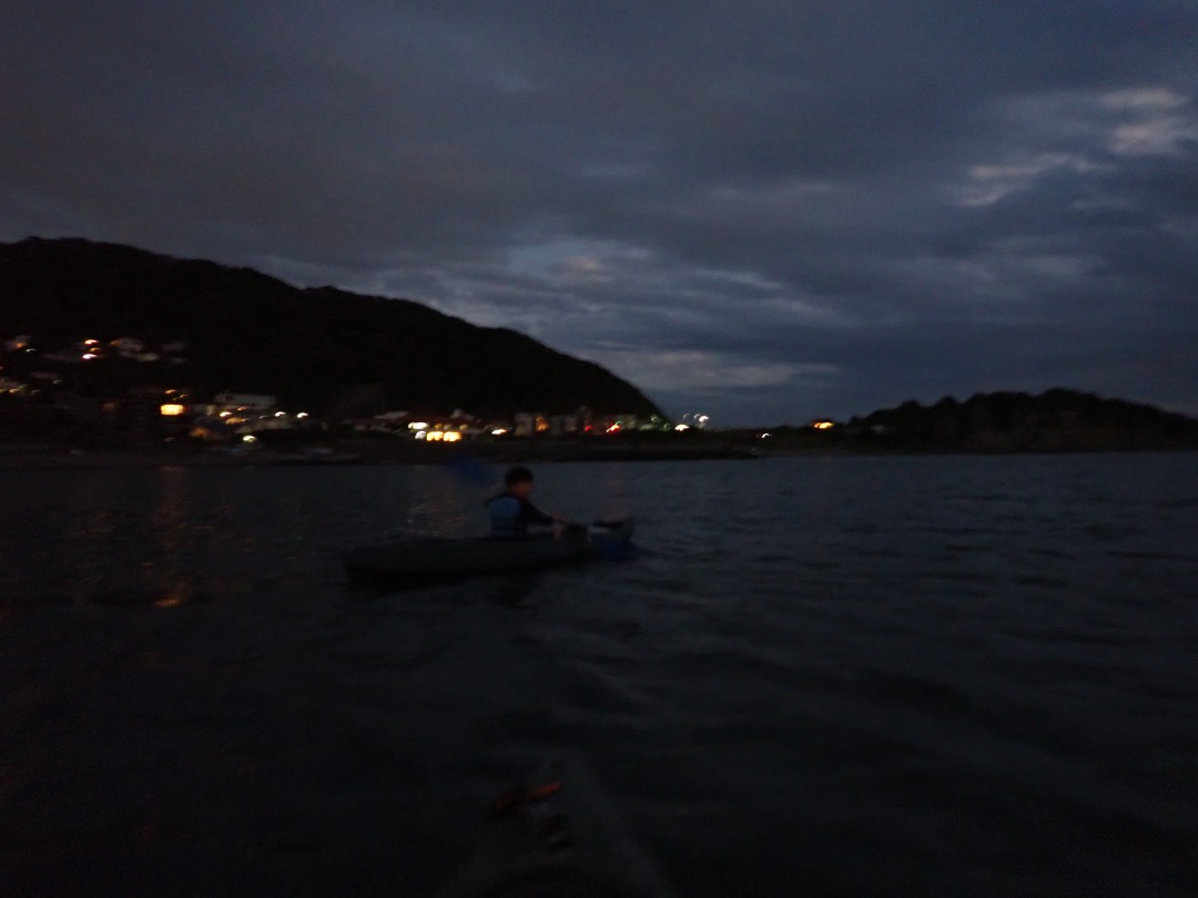 カヤックは小磯に上陸し、暗い海を戻ります。