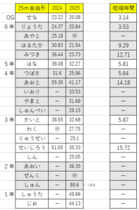 【ニッパーズ】プールweek3・年内最終回!2025-12-15今日で年内最終回!先週までの泳ぎ練習の成果発表の場としてタイム測定を行いました!みんな持てる力をしっかり出して良い締めくくりとなりました!年明けは1/12(祝月)~再開です!素敵なクリスマス&年末年始をお過ごしください!良いお年を! 【タイム測定-結果】25m自由形———昨年と今回の記録
