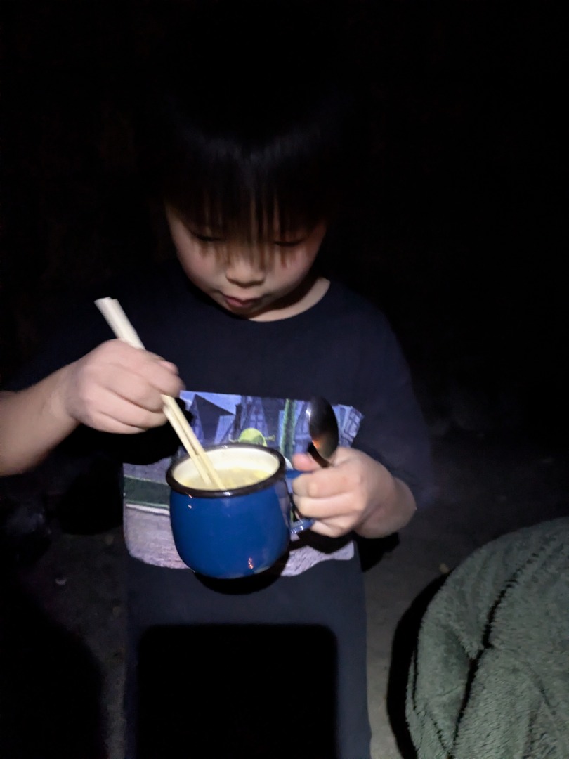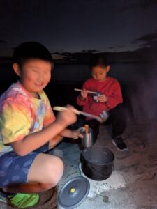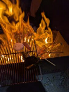 お湯を沸かしつつ、持ってきたものを炙って食べます。