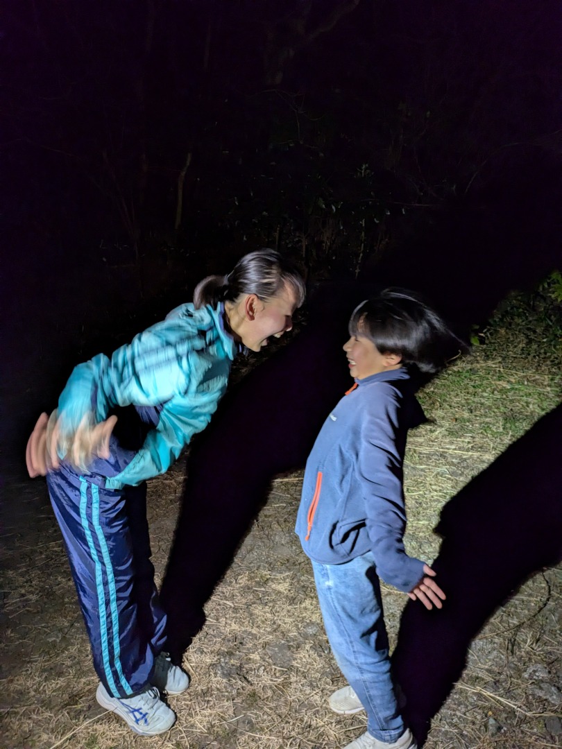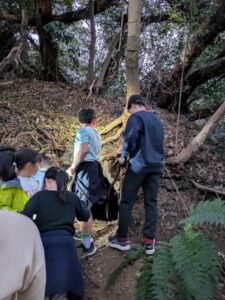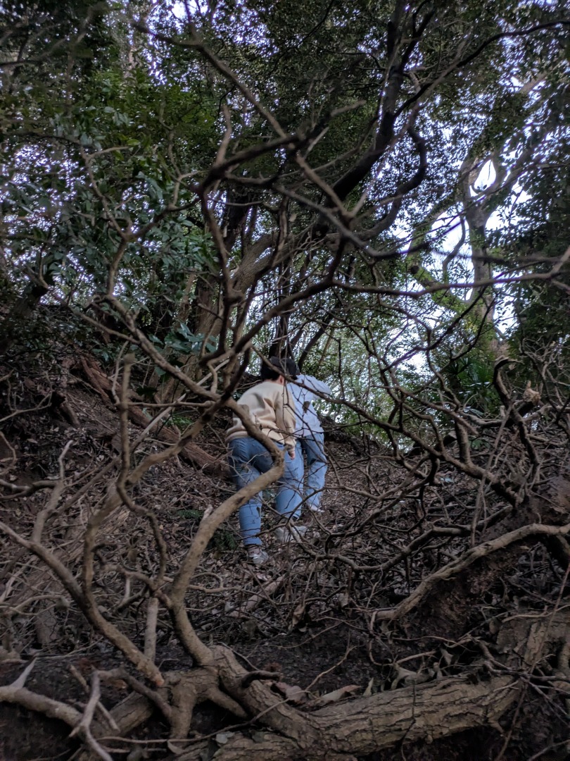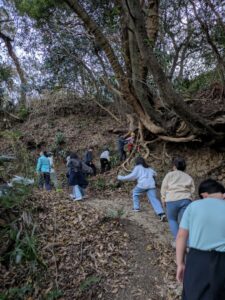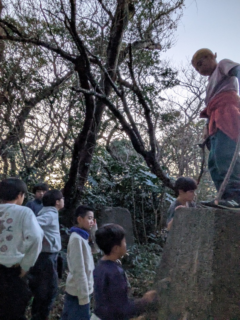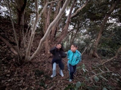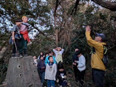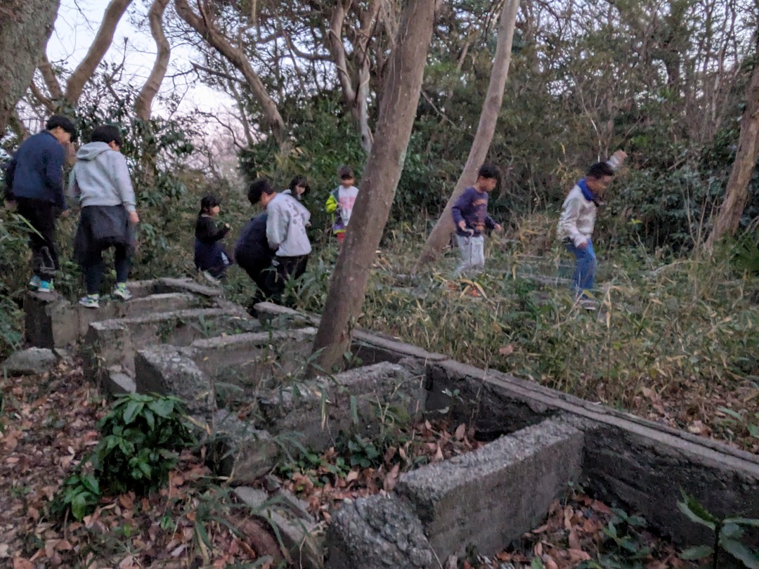 【葉山キッズ:火曜】砲台跡!2026-01-13今日から2026年スタートの「葉山キッズschool:火曜クラス」。第二次世界大戦の戦争遺跡を探して峯山を歩きました! ビジターセンターに集合。 準備をして出発。 ここから山道。 謎の穴を発見。 さらに進みます。 戦争遺跡。 藪をぬけて、久留和グランドへ。 10分ほど自由タイム。 ロードかトレイルかを選んで、走って戻ります。 また来週!