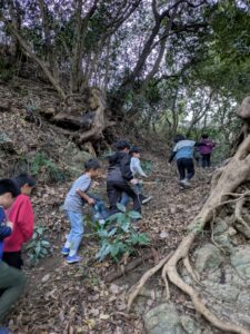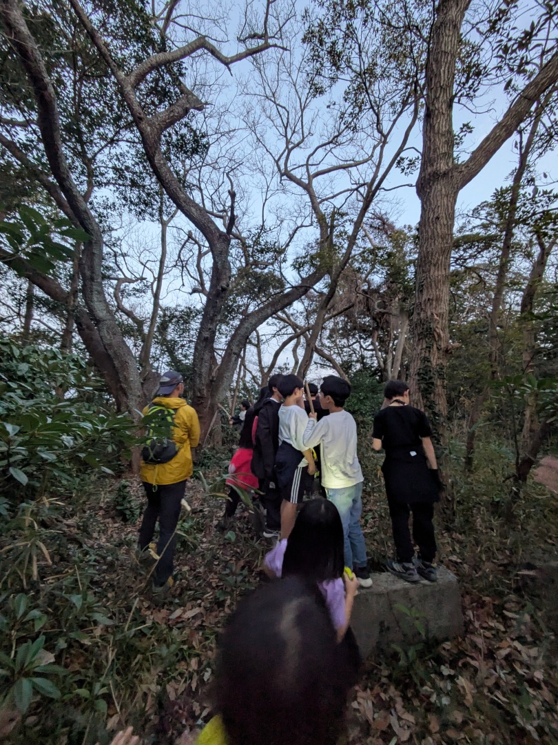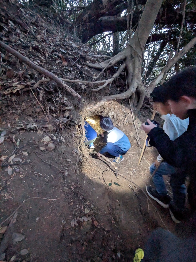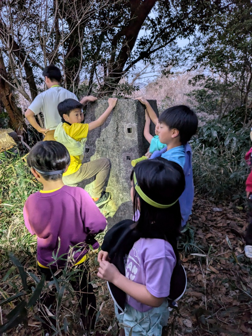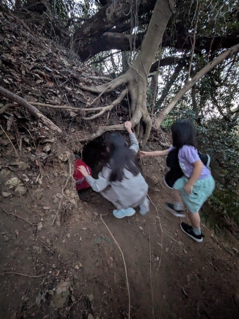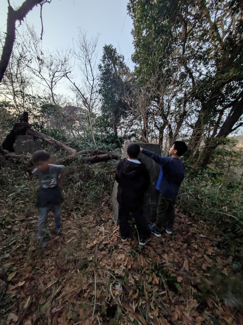 【葉山キッズ:木曜】砲台跡!2026-01-15今日から2026年スタートの『葉山キッズschool:木曜クラス』。峯山に眠る砲台跡を見に行きました! ビジターセンターに集合。 準備をして出発。 ここから山道。 謎のほら穴。 突然あらわれる人工物。弾薬庫の跡かな?さらに進むと、砲台跡。 藪をかきわけて、久留和グランドへ。 少し遊んだら秋谷側へ下ります。 最後は、道路沿いor山道の選択制。山道のほうが人気でした。笑 また来週!