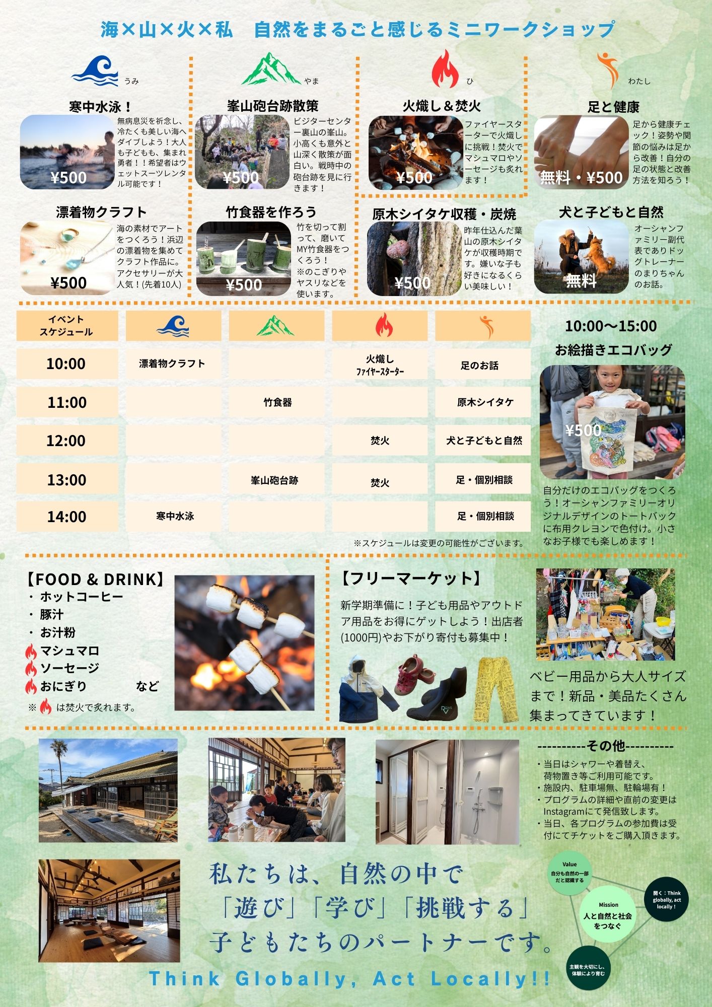 このコンセプトにもある「海」「山」「火」「私」を感じるワークショップを「コンセプト デイ!」と題し沢山準備しました。