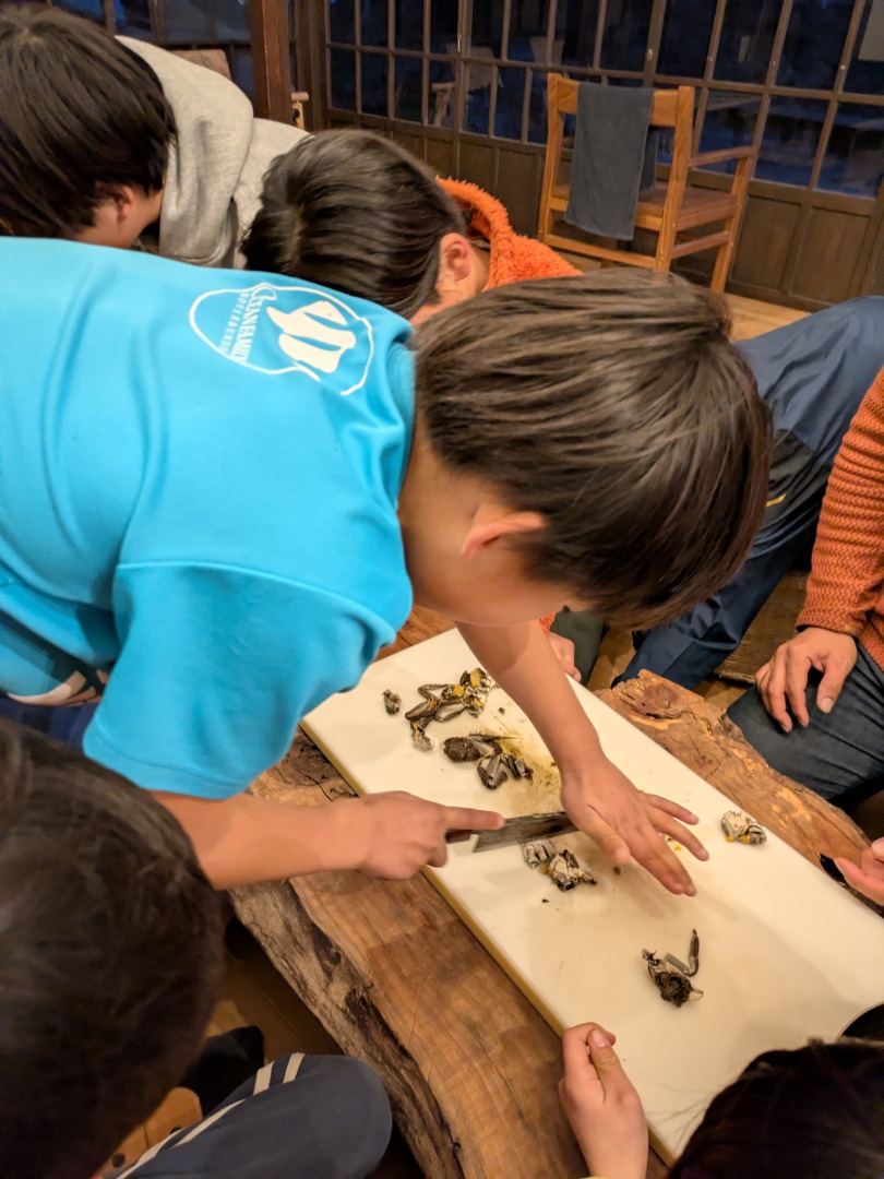 他の生きものの命をもらうとはどういうことかを感じてもらうため、かわいそうですがぶつ切りにする様子をみんなで見守ります。