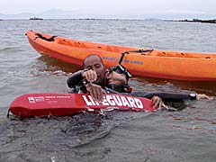 海中で溺者を確保。レスキューチューブを巻きつけフックで留めて環状にする
